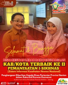 Prestasi membanggakan kembali diraih oleh Dinas Peternakan dan Kesehatan Hewan Kabupaten Lebak, yang berhasil meraih Penghargaan Kabupaten/Kota Terbaik ke-II dalam Pemanfaatan iSIKHNAS (Sistem Informasi Kesehatan Hewan Nasional) tingkat Provinsi Banten. Senin (26/01/26)