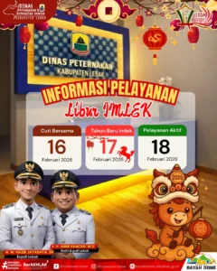 Dengan perencanaan yang baik, aktivitas pelayanan akan kembali berjalan maksimal setelah libur. Semoga momentum Tahun Baru Imlek membawa harapan baru, keberuntungan, kesehatan, serta semangat untuk terus menghadirkan pelayanan terbaik bagi kemajuan peternakan dan kesehatan hewan di Kabupaten Lebak.