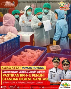 Melalui kegiatan surveillance Nomor Kontrol Veteriner (NKV), Bidang Kesehatan Hewan dan Kesehatan Masyarakat Veteriner (Keswan Kesmavet) Dinas Peternakan dan Kesehatan Hewan Kabupaten Lebak bersama Tim Auditor NKV Dinas Pertanian Provinsi Banten melaksanakan pengawasan pada unit usaha Rumah Potong Hewan Unggas (RPHU) PT CPI di Kecamatan Cileles. Kamis (12/03/26).